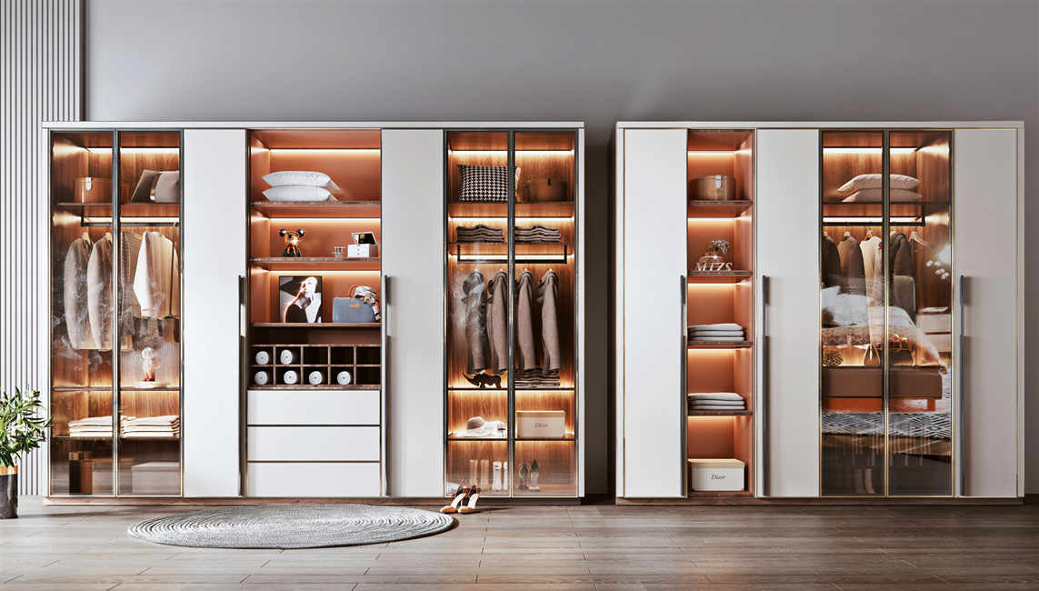 Đặc điểm: Ánh sáng LED (vàng ấm hoặc trắng) được lắp đặt bên trong các khoang tủ, chiếu sáng trang phục và phụ kiện.