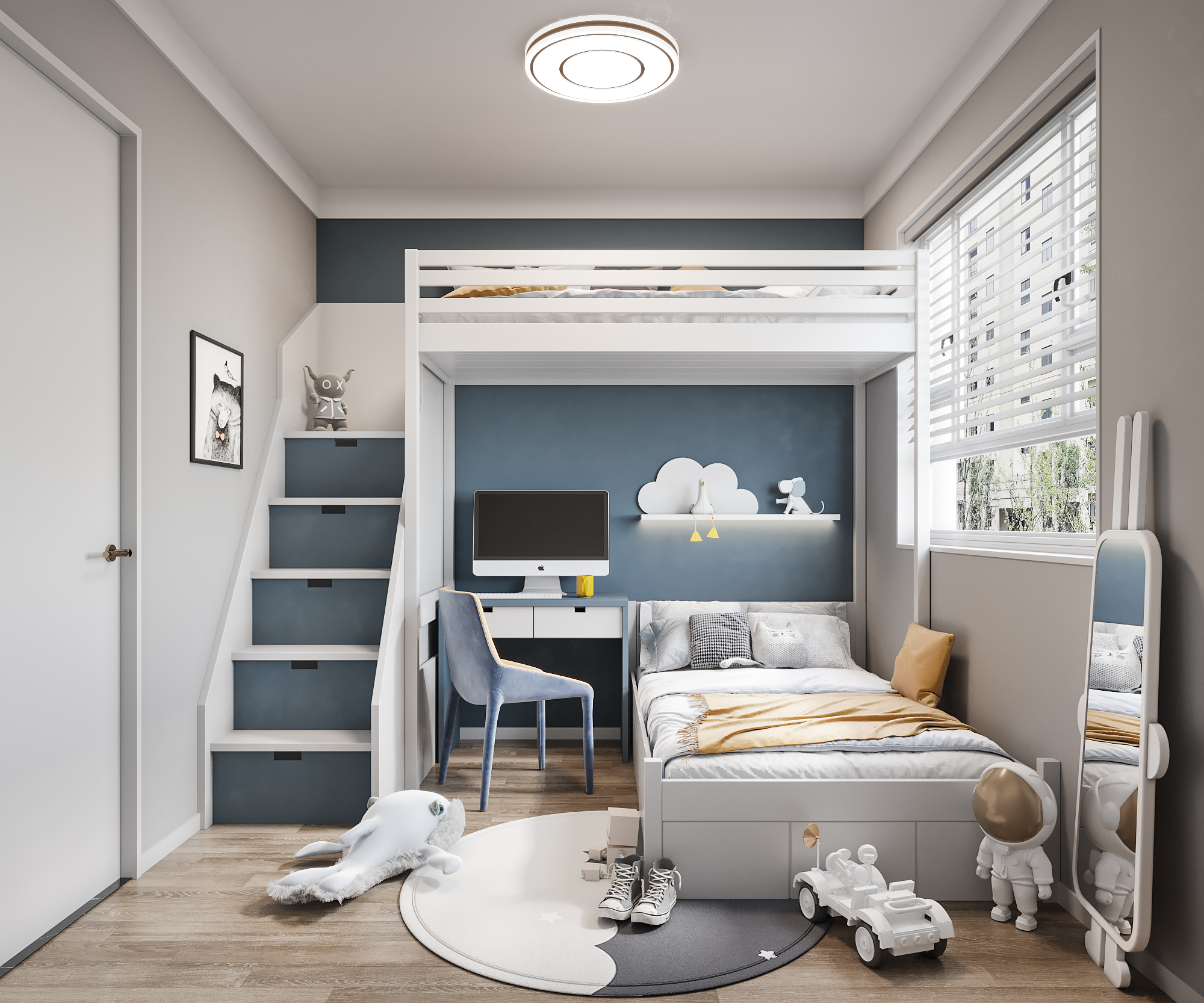 Không Gian Lưu Trữ Linh Hoạt: Ngoài tủ quần áo, nên tận dụng các hộc cầu thang, ngăn kéo dưới gầm giường và kệ mở phía trên bàn học để tăng không gian chứa đồ chơi, sách vở.