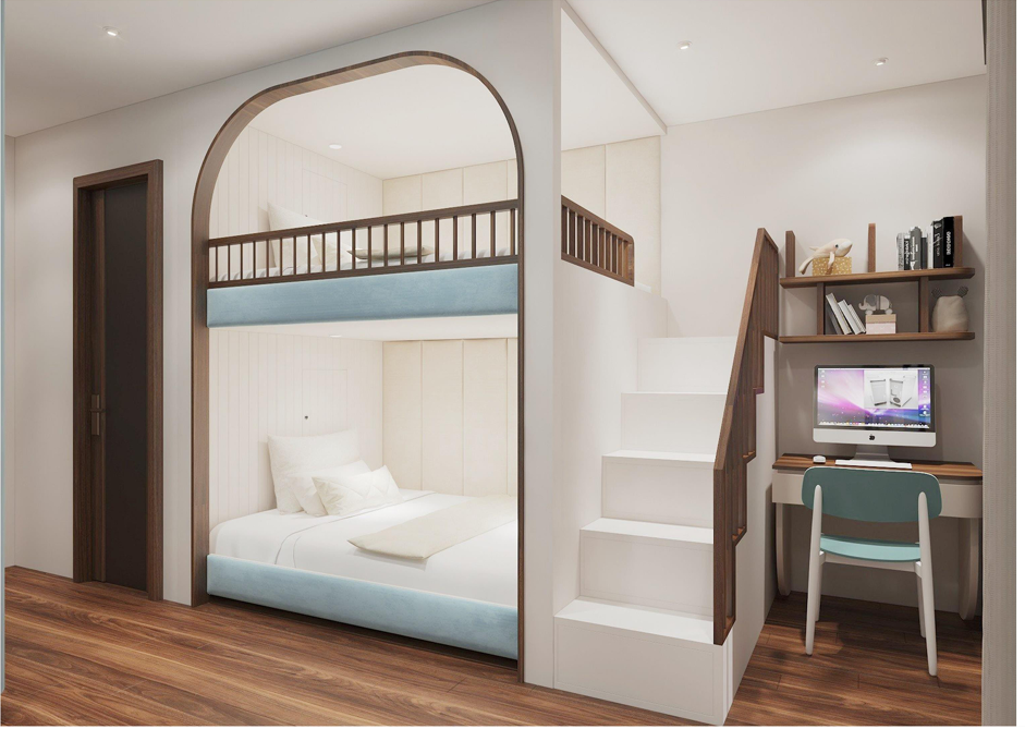 Phù hợp: Phòng ngủ cho hai bé nhưng vẫn muốn tối ưu hóa không gian học tập và lưu trữ. Bàn học có thể là bàn trượt hoặc bàn cố định bên hông.